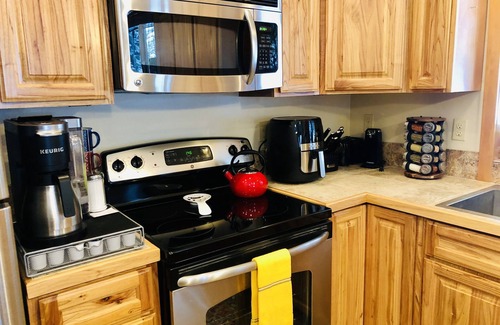 Kitchen is fully stocked with all the essentials for cooking a nice meal or baking a batch of cookies. Coffee/ Tea station that comes with a variety of tea, coffee pods, cocoa and creamer.
