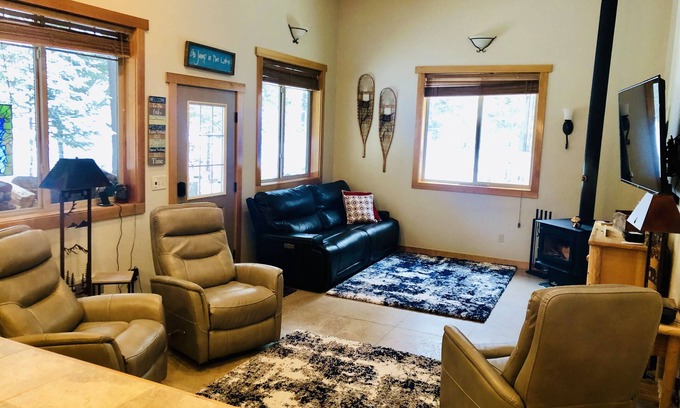 Our Cabin is approx 1000 sq feet with 2 bedrooms and a loft for extra sleeping space or used for a playroom for the kids. Living room has 3 swivel rocking recliners and a reclining electric sofa with a cozy wood stove that provides soothing warmth while mesmerized by the light show through the glass doors or just relaxing while watching a movie on the 65 inch flat screen TV with surround sound.