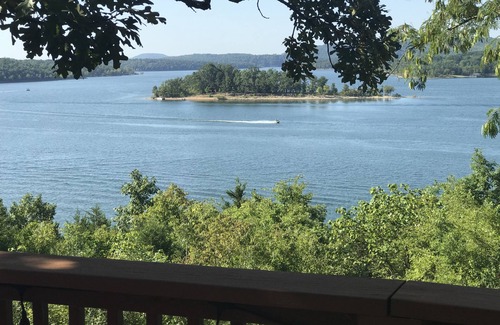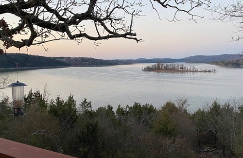 Nestled in the Mark Twain National Forest, just 15 miles west of Branson, you will find this amazing two-bedroom, two-bathroom home that comfortably sleeps 5 people. New deck, new windows, new countertops, new appliances. This property is on a lakefront lot that has an outstanding year-round unobstructed water view of Table Rock Lake. The location is a little bit of a drive from a lot of the attractions but well worth it if you are looking to be off the beaten path. There is a large lakeside deck attached to the home for relaxing and enjoying the view. The deck has an outdoor patio table, a bistro table with two chairs, and a propane grill for entertaining. Please no open fires or fireworks allowed. There are roughly 25 steps down a hill to the property. It is not handicapped accessible.