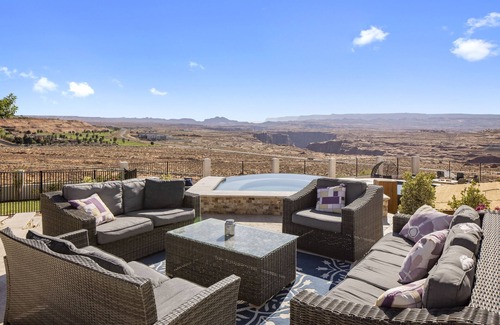 Our home, RIM VIEW CHATEAU at Lake Powell, is a gorgeous luxurious 3 story home of over 4300 square feet with 7 bedrooms and 4 full bathrooms that has amazing views and includes a beautiful spa and pool! With more than 300 feet of view fence, you find yourself nestled on a large private property that sits high on the Manson Mesa with unlimited views of Lake Powell, the Glen Canyon Dam, the Colorado River, Page National Golf Course, amazing plateaus and canyons that invite more than 2 million visitors per year! Go to our Video Links tab to see the home! At the Rim View Chateau, you control 'Time'. You can relax in luxury and fall asleep with your eyes wanting to stay open just to enjoy the views from your room. If you want to exercise, the most beautiful views you will find are located on the Rim View Jogging trail that are accessible just below this home. If your spirit is aggressive, the true beauty of this area is at your disposal...from Water Skiing, Snorkeling, Mountain Biking, Fly Fishing in the Colorado River, River Rafting or just exploring areas that are beyond imagination such as the Horseshoe Bend or the Skinny Caves... you will not find a better place to enjoy your vacation! As your day grows to an end, you will be fulfilled with a Sunset that only begs you to grab your camera and as the night sky takes over and the beautiful plateaus disappear, the sky becomes alive with millions of stars that can only be seen in remote areas such as this! This is your 'TIME', your 'TIME' to enjoy life. Come enjoy the Rim View Chateau at Lake Powell.