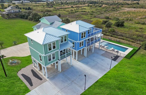 Welcome to Blue Haven Cottages! NEW property with 2 units - separate rentals (Breezeway & Bayview) & private pool in a serene neighborhood. Behind the Galveston State Park and overlooks the Bay. Each unit offers a cozy, spacious/modern interior, 65 in smart TV, fully stocked kitchens, dining areas, 2 bedrooms with king beds, 50 in smart TVs, bunk beds 2 twin, 2 ½ bath and stunning views from various deck.
