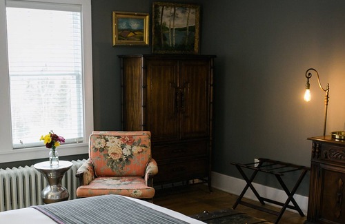 The Bluestone Basecamp is a tranquil haven of smart design and swank decor. Within a restored and re-envisioned 1940s brick manor, each guest room is exceptional, offering ensuite bathrooms, premium linens, WiFi, Apple TV and amazing vistas. Found, repurposed and vintage pieces appoint the interior with touches of original artwork and modern conveniences.The oversized living room has abundant seating, a brick fireplace and a baby grand piano. The fully-equipped gourmet kitchen is ideal for creating delicious memories. It overlooks the back patio with Wisteria-covered arbor, outdoor lounge and Weber gas grill.