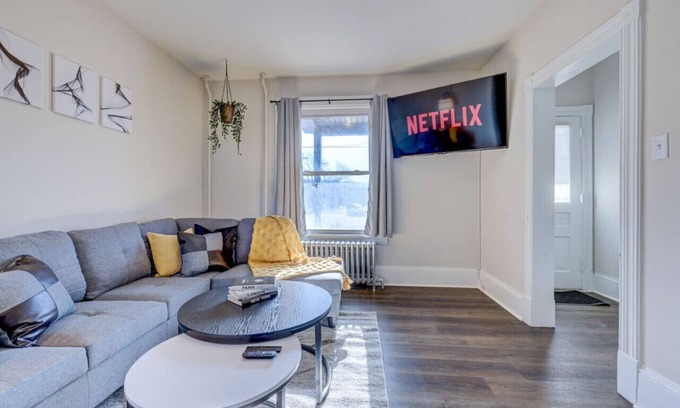 Enjoy a stylish experience at this centrally-located townhome. Located in the heart of Stroudsburg, we welcome you to the poconos! 15 mins from Shawnee, 10 mins from The Crossings Outlets, 5 mins from Stroud mall, walmart, and many restaurants. 2 full kitchens is provided, 4 free parking spaces, 2 washers and 2 dryer, and 2 King suites! (1 in each unit)