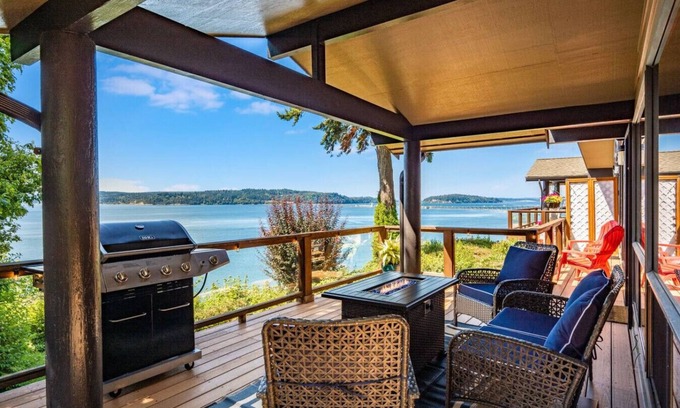 Step outside and relax in the cozy outdoor lounge, complete with a plush patio set, propane firepit, and BBQ grill. Watch as the Hood Canal Bridge retracts to welcome Navy submarines, commercial ships, and sailboats passing through—an experience that’s both rare and mesmerizing.