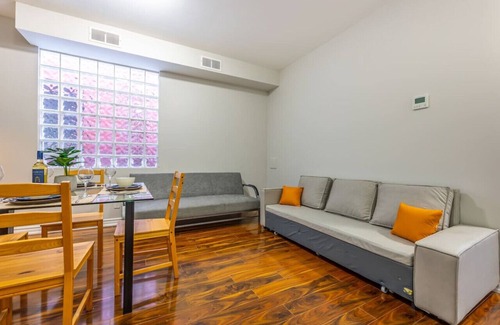 Our inviting 1BR apartment in Niagara Falls is designed for comfort and convenience. The open-concept living area features a comfortable sofa, a flat-screen TV, and a dining space for two.