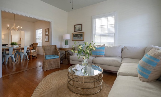 This Dade County pine house has a strong connection to the sea. It was built in 1910 by ship's carpenters and owned for decades by a modern day ship salvager. This beautiful and spacious 3 bedroom 2.5 bathroom home is in a lovely peaceful neighborhood. Enjoy a comfortable indoor/outdoor lifestyle with plenty of living space. Full of fun vintage, antique, and modern furniture and decor, the home retains its vintage charm, while updates make for easy modern living. The flexible space works for families, couples, and friends. Separate living areas flow together allowing everyone some space and makes the house feel very spacious. There is ample storage and we have provided everything you need to make your stay as comfortable as possible. The large kitchen has granite countertops, an island with seating, and brand new SS appliances. The breakfast room in the kitchen is the perfect place to enjoy your morning cafe con leche from a neighborhood coffee shop. There are three outdoor spaces with a lovely view of the neighorhood from the second story porch. Enjoy friendly neighbors, walking to morning coffee, restaurants, art galleries, the grocery, the beach, and more. The yard is fully fenced and there is easy parking directly in front of the house.