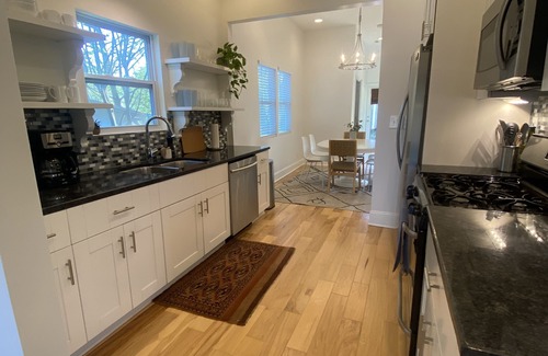 Bright and airy 2 bedroom/2.5 bathroom home in North Shore, one of Chattanooga's most coveted neighborhoods. Lots of natural light, with 12 foot ceilings and windows galore! This cozy home is perfect for 2 non-coupled adults (or 1-2 couples), as the bedrooms, with their own private attached bathrooms, are on opposite sides of the home. Enjoy cooking in a fully-stocked kitchen, including a gas stove and dishwasher. In-unit laundry is included. 2 private off-street parking spaces with alley access are available behind the home. Take in some of the most beautiful sunrises while sipping coffee on the spacious front porch.