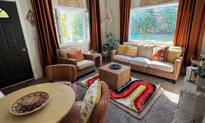 The home has been updated with new aesthetics for a relaxing and comfortable experience. Each piece of furniture and art has been carefully curated for guests to enjoy. Vintage textile wall art, metal art, and pottery adorn the house. Upon entering from the rear of the home there’s 3 steps in the small entryway into the kitchen. There’s pots, pans, dishes, spices, and all the basics to make meals. Off the kitchen is an oval dining room table that seats 6. There’s an adjacent space with a sofa twin bed pull out and a work station desk. There’s 1 bathroom with a shower tub, well lit vanity, toiletries, and plenty of towels and washcloths. A mirrored bi-fold door separates the bath area from the washer and dryer.