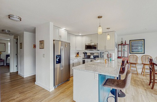 This 1,000 square foot, the single level condo includes a fully equipped kitchen, a dining area, a living room with TV/DVD, and access to a patio. The condo sleeps 6 with a deluxe queen air mattress, and built in electric pump. Additionally, the condo has a chair that converts to a single bed (futon style) in the living room.' The private patio offers a gas BBQ grill, and you'll also have access to a community outdoor pool and shared a hot tub.