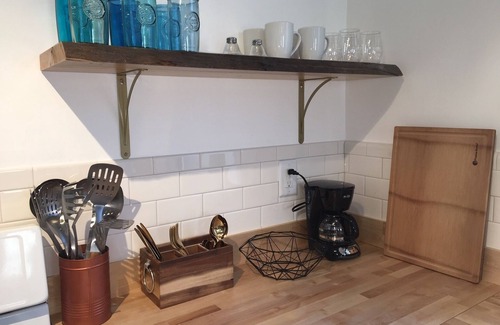 Freshly renovated light-filled studio, located in downtown Hudson just off Warren Street, accommodating up to three adults, a couple, solo travelers or a family, with partially enclosed bed nook and living area. Clean kitchen with island that doubles as desk/workspace. One bathroom with shower. Smart TV. Bluetooth Speaker. Leather (non-pullout) sofa with extra dedicated bedding for a third adult or child. ALL NEW EVERYTHING with a blend of vintage and modern touches. Hand-built by local residents and artisans. Shared backyard to enjoy.