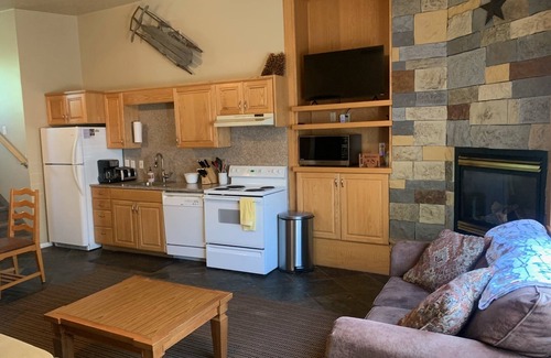 The open living area is warm and welcoming, featuring a fireplace and plush seating for evenings in. The fully equipped kitchen has everything you need to prepare meals at home, whether you're whipping up a quick breakfast before hitting the mountain or cooking dinner for the whole crew.