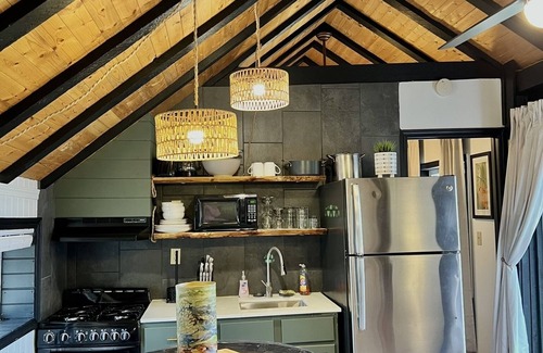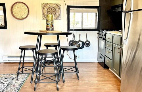 Cottage 1 has a spacious great room/living room with tall ceilings and lights wrapping around one of the beams. The kitchen has a full-size refrigerator, a 24" gas stove/oven, a quartz countertop with a custom tile backsplash, and a stainless sink. The dining space can accommodate four guests and be prep space if required.