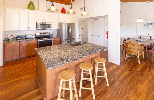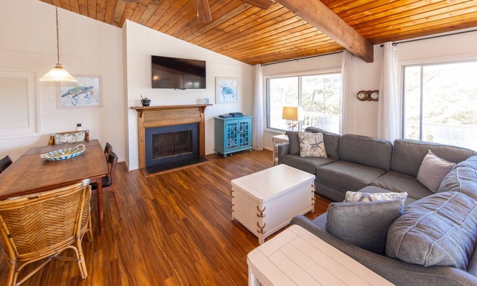 A warm, inviting coastal beach cottage with comfortable furnishings and easy beach access for you and your 4 legged companions.The lower level of this cottage is outside access only, it features a separate entrance with a Queen bedroom, a half-bath, laundry room with a HE washer/dryer and an extra refrigerator. The upper level is spacious, offers beautiful views from the great room, four bedrooms, and two full bathrooms. This home is also equipped with an elevator for guest use.