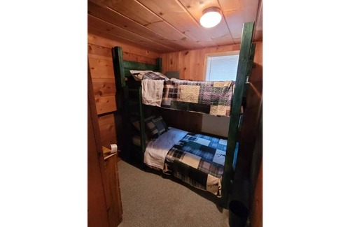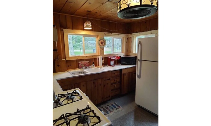 Sleeps 6. Two bedrooms with queen beds, and one bedroom with bunk beds. Large living area with a sun porch facing the lake, perfect for enjoying your morning coffee or taking in the beautiful sunsets. Fully stocked kitchen and full size stove and refrigerator.