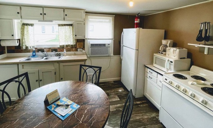 Step back in time at Brookside Cottages & Resort. Our resort consists of 14 unique, quaint & simple cottages built in the 1920s and a large 2,800 square foot main house. Nestled on 5 acres with 350' frontage on Duck Lake and 600' on Mason Creek, a registered trout stream. In-ground heated swimming pool & hot tub (Memorial Weekend - Labor Day only), Game room with WiFi (Open 9a-10p), Coin operated laundry, playground, horseshoes, sandy beach area, boat docks, water trampoline, kayaks, paddle boards, row boats. Access to the resort amenities is shared amongst all guests of the resort. You are minutes from downtown Traverse City, Interlochen Arts Academy, Sleeping Bear Dunes, Lake Michigan, and area attractions for everyone. Dandy Cottage sleeps 6 guests in two bedrooms with a private bathroom and kitchenette. Enjoy your vacation at this peaceful resort!