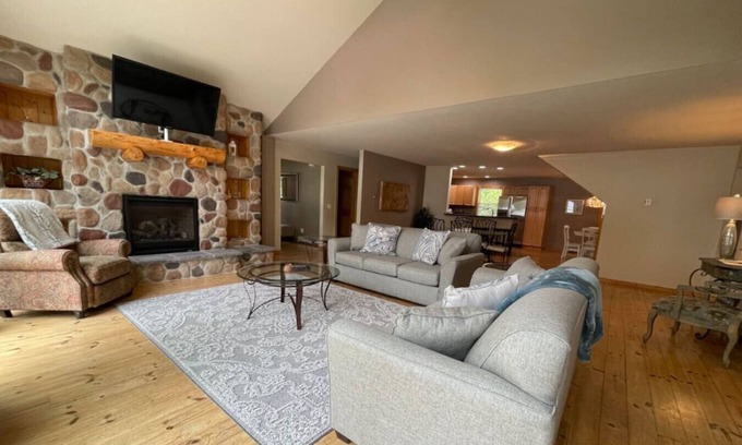 In the living room, the cultured stone fireplace is flanked by a rustic timber mantel & built in shelving, and the massive front sliding doors overlooking the deck with views of the property and peeks of the lake are the focal point of the living area. A flat screen tv with cable can be viewed from the two sofas, one of which is a queen sleeper. The main dining table seats 6, the breakfast nook seats 4-6, there are 2 seats at the kitchen peninsula. On the deck, there is a propane gas grill and a gas firepit table with chairs. The shared in-ground heated swimming pool is just steps away from the back deck of the house. The pool and hot tub are shared amenities of all guests of the resort; including the Big House, 13 cottages, apartment and 2 RV sites.