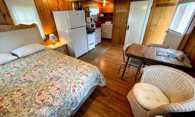 Step back in time at Brookside Cottages & Resort. Our resort consists of 14 unique, quaint & simple cottages built in the 1920s and a large 2,800 square foot main house. Nestled on 5 acres with 350' frontage on Duck Lake and 600' on Mason Creek, a registered trout stream. In-ground heated swimming pool & hot tub (Memorial Weekend - Labor Day only), Game room with WiFi (Open 9a-10p), Coin operated laundry, playground, horseshoes, sandy beach area, boat docks, water trampoline, kayaks, paddle boards, row boats. Access to the resort amenities is shared amongst all guests of the resort. You are minutes from downtown Traverse City, Interlochen Arts Academy, Sleeping Bear Dunes, Lake Michigan, and area attractions for everyone. DuckIn Cottage sleeps 2 guests in one bedroom with a private bathroom and kitchenette. Enjoy your vacation at this peaceful resort!