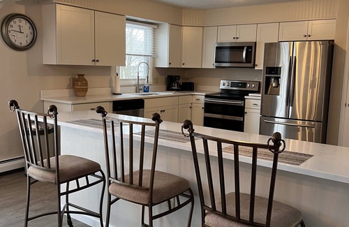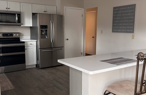 • Fully renovated luxury kitchen stocked with plates (glass, plastic, and kids), cups (glass, plastic), pots and pans, utensils; all new appliances including refrigerator, microwave, dishwasher, and electric stove; quartz counters, brand new cabinets, and a table that seats 8, also 3 additional seats at island