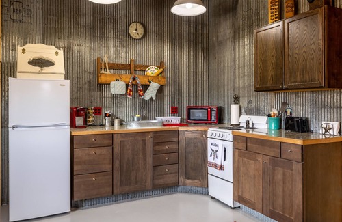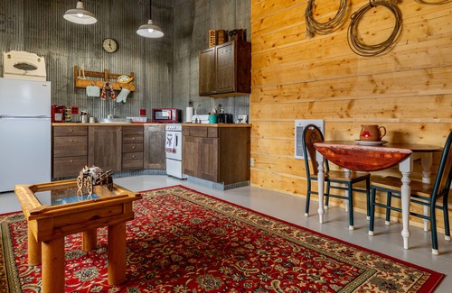 Buckshots Bunkhouse is a great getaway for couples. You'll have everything you need in this 1 bedroom, 1 bathroom bunkhouse with unique Western furniture and decor. The living area is open to the kitchen and dining space. The bedroom features a comfortable queen bed and large armoire for clothing storage. You can write letters to home from the desk as you look out at the expansive views of the Wapiti Valley. The bathroom features a unique sink fashioned from a whiskey barrel and a custom step in shower with the most unique showerhead!