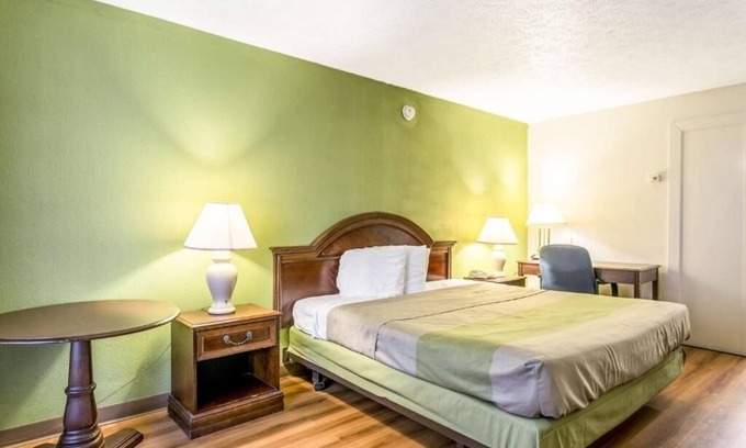 Welcome to your budget-friendly haven, perfect for business, pleasure, or just passing through. Our room offers comfort with a flat-screen TV with cable, free Wi-Fi, and in-room amenities like a microwave and mini-fridge. Start your day with our complimentary grab-and-go breakfast, enjoy meals at the on-site restaurant, and take advantage of the fitness center and laundry facility. We're pet-friendly too!