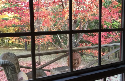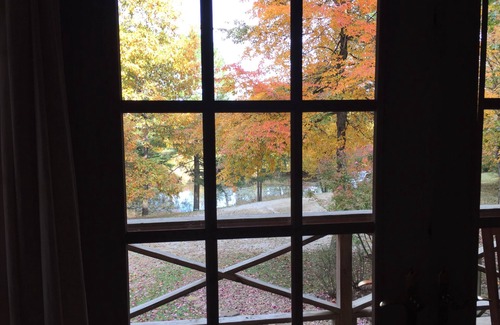 You will find that the farmhouse is very roomy, and it can comfortably sleep seven. There are three over-sized bedrooms for your comfort. On the main level is the master, and it has a king bed, adjoining full bath, and wrap around windows overlooking the pond and woods. Upstairs are two additional bedrooms that almost feel like suites. One bedroom has a king bed that adjoins the bathroom, and the other bedroom has 3 twin beds making it a perfect kids' room! There is a Jack and Jill bathroom that the two upstairs bedrooms share.