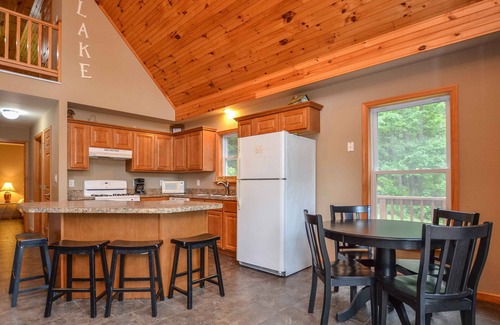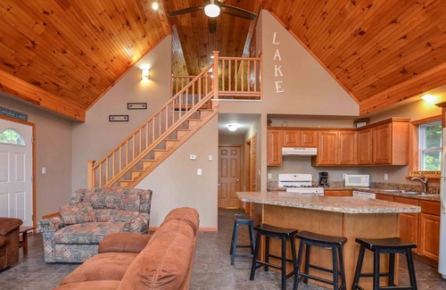 The open floor plan is ideal for entertaining friends and family alike. You'll find meal prep easy with a kitchen that comes fully stocked with all your favorite cooking and baking ware. A large island with breakfast bar separates the kitchen and living area. Chat with the chef of your group while they prepare a dish to remember.