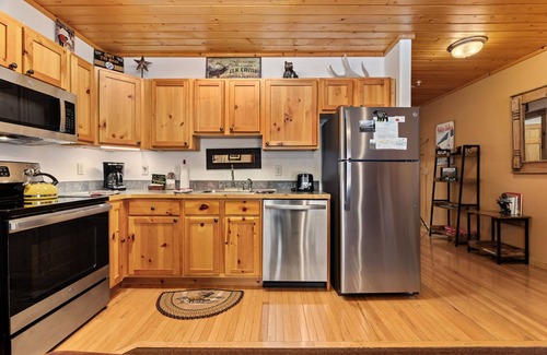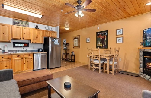 This beautiful 1-bedroom, 1-bathroom condo features a private hot tub. King-sized private bedroom. Private bathroom with bathtub/shower combo. Fully equipped kitchen with dining area. Living Room has a sofa sleeper and cozy gas fireplace. The private deck with a hot tub and patio furniture overlooking Fall River. Enjoy watching the wildlife! Wi-Fi. Free fishing. Come relax with us and enjoy the view.