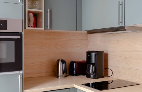 A little integrated kitchen serene in sky blue. It's small but well-equipped, boasting a washer/dryer, oven and that all-important coffee maker.