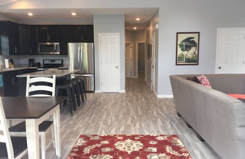 This new cottage constructed in 2017 is on one level and located on top of a hill in a private wooded setting with a year round view of Kentucky-Barkley Lake in the quaint Little Lake Village subdivision in downtown Grand Rivers and is finished in high quality, coastal cottage architectural style. I have unlimited free AT&T 1 GIG Fiber internet with speeds up to 1,350 Mbps and many streaming services which may include YouTube Live TV, Disney+, Hulu, Prime Video, ESPN+, etc. Modern amenities include four different 4K TVs (65", 55", 50", 43"), washer and dryer, and a fully-equipped kitchen/750-sq.-ft. great room with 12.5 foot vaulted ceilings.