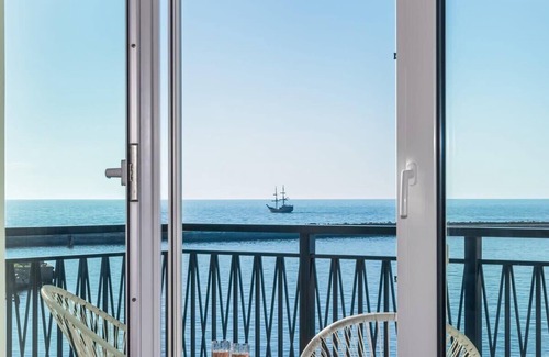 This fully furnished studio apartment can accommodate four people - ideal for a family or group of friends. The accommodation features an open plan living room with kitchenette as well as a discreetly hidden double bed separated from the living room by a sliding glass wall to provide guests with greater privacy. The interior of the apartment is flooded with natural daylight, which contributes to a positive atmosphere. The modern furnishings of the apartment and the combination of white walls and wooden floors give the apartment an elegant look. A sofa, chairs and blankets in different shades of blue, which harmonize perfectly with the beautiful view of the open sea, complement the harmonious interior design. Guests working from home can use the living room table to complete their daily tasks without interruption as the apartment has access to free Wi-Fi. Other amenities include a television with SmartTV technology and air conditioning that ensures an optimal room climate. Guests also have access to basic accessories such as iron, ironing board, vacuum cleaner and hairdryer. The bathroom is stocked with toiletries and towels.