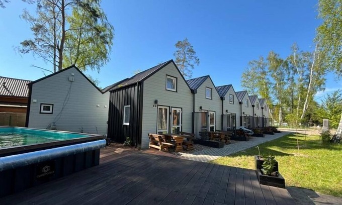 Newly built family resort with swimming pool. In addition to modern wooden bungalows, there is a colorful playground for the youngest guests. The resort also provides a parking space. The location of the commune makes the small, charming Dziwnów swimming pool an ideal place for water sports, hiking or simply relaxing. Particularly noteworthy is the drawbridge that connects the mainland with Wolin Island. Nearby activities: The village of Dziwnów is an ideal place for water sports such as sailing, windsurfing and kitesurfing, wakeboarding and diving. The village has a spa park, pine forests and a promenade encouraging walks and bike rides. In the port, pirate ships and converted fishing boats invite you for cruises on the Baltic Sea Mobility : Not suitable for people with reduced mobility