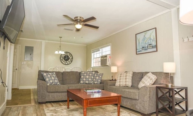 Bungalow near Main is located in the quaint town of Grand Bay, AL. At this newly renovated vacation rental, you’re only 30 minutes away from the white sandy beaches of Dauphin Island, 25 minutes south of the city of Mobile and 40 minutes east of Biloxi, MS. (If you have time, take a day trip to New Orleans, which is only an hour and 45 minutes away!).