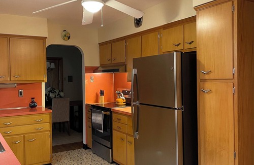 Sprawling and inviting mid century modern bungalow, sleeps up to 8 people . 1 Car garage and lots of Private off street parking. This home has a full retro eat in kitchen and 2 full and 1 half bathrooms. Towels, bedding, and cookware provided. Garage door has automatic opener. and the house is located i na very cute and safe part of town. Just minutes from UPMC hospitals, Holy Spirit, and Downtown Harrisburg. The Carlisle pike has all the best eateries and bars. This house is charming and full of light. The living area is huge and features a wood burning stove that is sure to keep you warm in the winter.. the basement has a humungous Rec room that may be used for kids to play in (sorry no Games or tv's in the basement just yet.) The house has central air conditioning, and a smart tv located in the living area along with WIFI throughout the home.