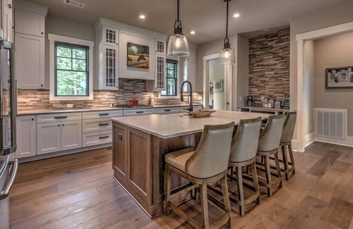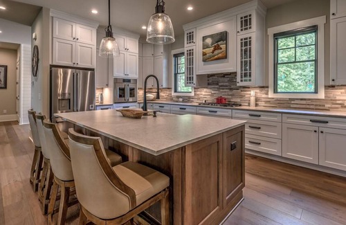 Kitchen - fully equipped main level kitchen, stainless steel appliances, French door oven, 5 burner gas stovetop, 3 door refrigerator with ice and water, wine refrigerator, custom white cabinets, quartz countertops, coffee bar, breakfast bar seats 4, kitchen utensils, microwave, crockpot, blender, toaster, drip coffeemaker (bring basket filters)