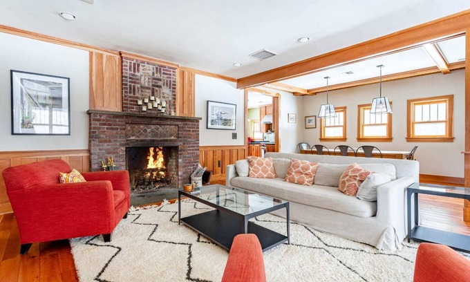 The sizable chef’s kitchen includes a Wolf stove with griddle and other high end appliances, with all the gadgets (food processor, blender, etc.) you’ll need to prepare your feasts. And once the food is ready, you’ll have to choose whether to dine at the long farmhouse table inside, or adjourn to the screened porch on temperate days for your meals. The porch also has a comfortable lounge area, where you can find yourself serenaded by the vocal bird population, or where you might recline and watch the big game on the wall-mounted television.