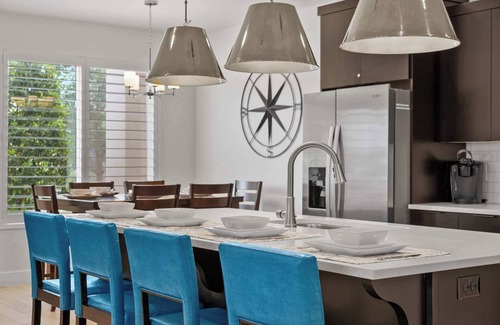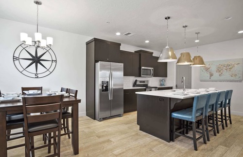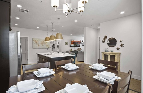 A modern kitchen with a beautiful white countertop island greets you as you walk in the door, inviting you to cook your favorite meal on stainless steel appliances and enjoy it around the dining room table with seating for 6.