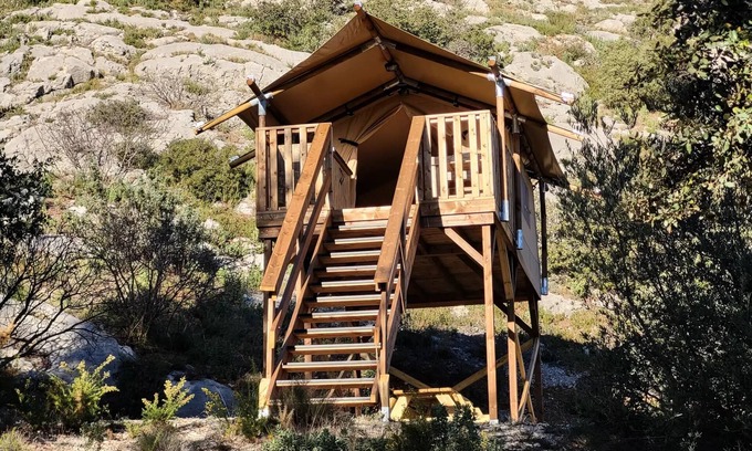 Accommodation: Set yourself in our lodge on stilts perched 2m20 high for a unique experience in immersion with nature on the Sainte-Victoire mountain. From your bed or covered terrace, enjoy the breathtaking view! Change of scenery and disconnection guaranteed alone, in couple or duo!With its wooden structure and canvas walls, our lodge for 2 people with electricity is equipped:a spacious room which benefits:- large side openings perfect to enjoy the view- a comfortable bedding (bed 160*200 or 2 single beds 80*200) with alèses, duvets and pillows and sheets ready upon arrival- 2 bedside tables for your personal items- a shelf for your clothes- a fan if necessarya covered terrace in extension of the room with:- Table and chairs for 2 people- Corner bar/kitchenette with kitchen furniture, a small fridge, a coffee machine, complete dishes for 2 peoplea relaxation area below the lodge with 2 Chileans perfect for a nap or a moment reading to the calm of nature and the smell of Provence.