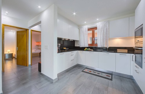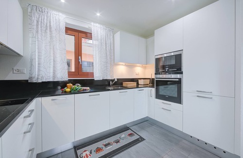 Inside, the 2-bedroom apartment has a very spacious and modern living complete with large windows for lovers of natural light and a cushy leather sofa with a large flat-screen TV to unwind. Adjoining this area is the elegant kitchen and dining area for carefree in-house dining. In the modern kitchen of the apartment, you will find everything at your disposal for a hassle-free self-catered stay; a dishwasher, microwave, oven, fridge and coffee machine are available for our guests here. A washing machine and ironing facilities are also available for extended stays in Lugano!