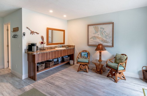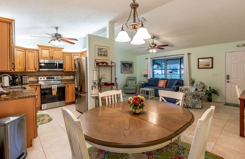 Featuring the perfect place to kick back, relax, grill, watch the game pool side! Our home features a HEATED and Screened pool with a soothing waterfall. The main house has a spacious King Master Suite with pool view/access and a private full bath. The twin guest room has it's own full bathroom. Off of the pool deck, enjoy our Private Cabana! The Cabana is a King Master Suite providing a full bath, coffee bar, and dedicated patio. Perfect for multi couple arrangements and/or extra guests.