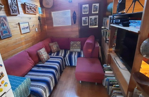 This home is open plan, split level with large windows in the lounge area and surrounding decks facing a view of bush and sea. Enjoy this space by picking out one of the 100s of books which are dotted on shelving throughout the house all the while listening to the kaka, tui and kereru in the towering powhutuakawa tree.