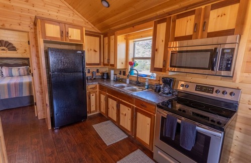 There is a front patio with chairs and a coffee table. The cabin has a smart TV as well as Wi-Fi. The kitchen is fully equipped with silverware, dishes, knives, pots and pans as well as a full-size fridge, stove, microwave and drip coffee pot. The bathroom has a flush toilet, roomy shower, hot water and we provide the towels.