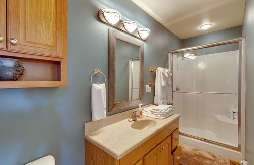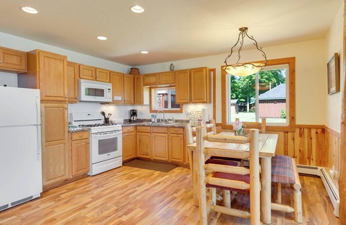 The fully-equipped kitchen provides modern appliances, cookware, and ample counter space, making meal prep easy. Step outside to a private deck with stunning views of the shimmering lake and surrounding wilderness.