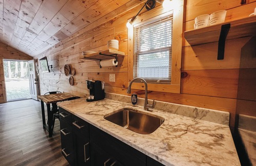 The tranquility of the woodlands is where you'll find Hartwell Cabins and RVs! Cabin #1 is a 450 square foot cabin, equipped with everything you'll need for a relaxing stay.