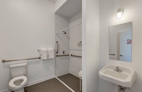 Unique space set up to be ADA accessible with wide walkways, step-free shower,