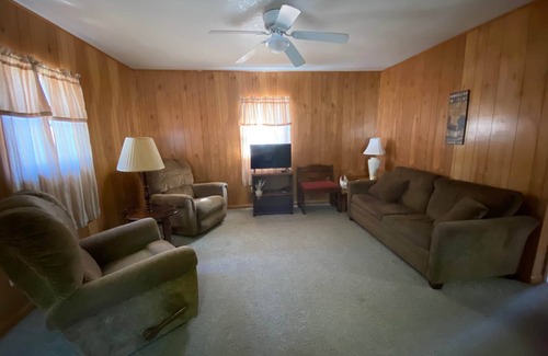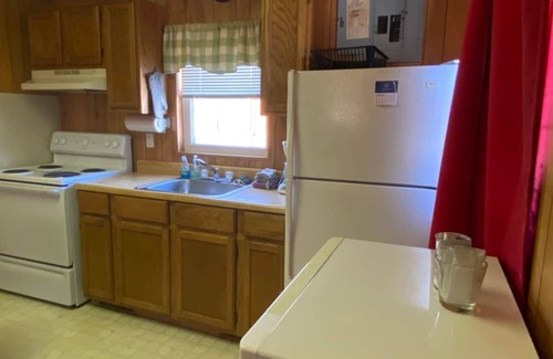 Cabin 11 - two-bedroom cabin, one bedroom has a double and a twin bed, other bedroom has a king bed. Fully equipped kitchen and comfortable living room area with two recliners and a sleeper sofa.