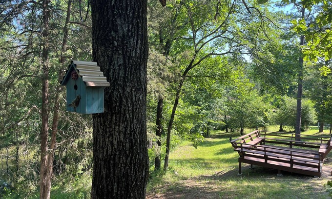 Outside, you'll find a table with chairs on the partially covered deck. Relax and watch the birds come to the bird feeders, or enjoy time around the firepit shared with cabin 15 in the evening.