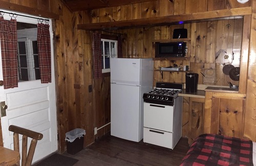 This one room cabin is 202 sq ft and sleeps 2 people in the queen size bed which adjoins the kitchen and dinette. The bathroom is simple, the shower is warm and the kitchen has everything to cover your basic needs. The spacious 10’x7' enclosed porch overlooks the water. A perfect area to enjoy a quiet evening watching the loons. The cabin has 1 electrical outlet near the bed and other electrical outlets minimally located throughout the cabin.