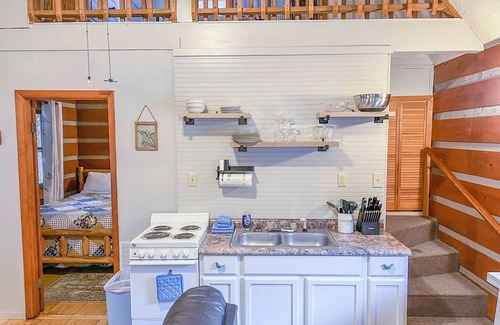 Cabin #2 is perfect for a couple looking for a romantic getaway or a small family vacation, with a deck overlooking the river! This unit has a private queen bed downstairs, and a full bed in the loft. New gas log fireplace and HVAC system along with wifi and YoutubeTV to keep you and your party entertained.