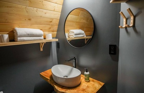 ArtBliss cabin 1 and 2 feature South facing balconies with stunning views of Columbia River Gorge. Scandinavian-inspired architecture with modern comforts. This A frame cabin features two plush queen beds—one on the main floor and the other in a cozy loft accessible by a secure ladder. The living area is warm and inviting, with a gas fireplace, and a smart TV for quiet evenings. Please note, cabins 1 and 2 are located closer to the road and may be exposed to some traffic noise, more than cabin 3 and 4.