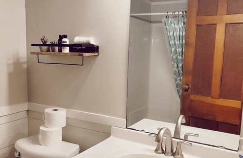 The bunk room in the far back of the cabin cancomfortably sleep 4 people in the twin bunks and one doublebed. The front bedroom, nearest the main living space and bathroom,has a king size bed, and theback bedroom has a double bed. The two bedrooms toward the back of the cabin both have nice-sizedclosets. Ceiling fans circulate the air in 2 of 3 bedrooms. Thebathroom has a tub/shower combo, fresh painted walls with wainscotting, and a new, modern vanity and lighting.The large, open conceptkitchen and living area spans across the entire front of the cabin with nice windows on either side of the front door to take in the lake views.